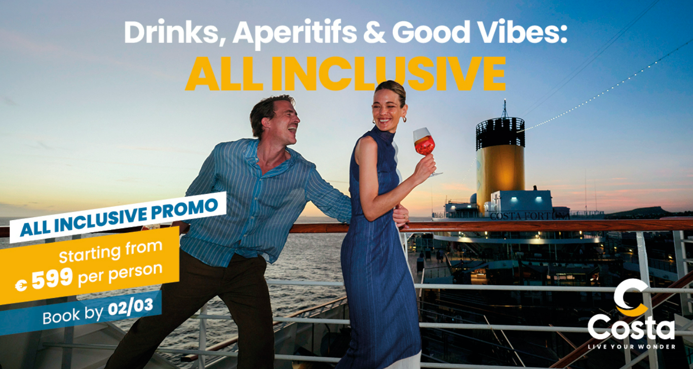 Na voljo je odlična promocija za Costa Cruises: all-inclusive križarjenja po neverjetnih cenah! V ceno so vključeni paketi My Drinks za odrasle in My Soft Drinks za otroke, zato bo vsak član družine užival v brezskrbnem dopustu.