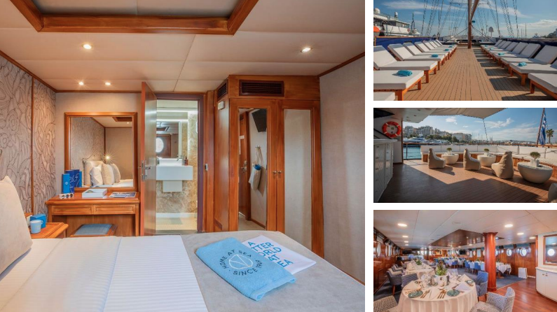 • Vse kabine so zunanje, na zgornji palubi z velikimi okni in na spodnji palubi z odprtinami za okna.